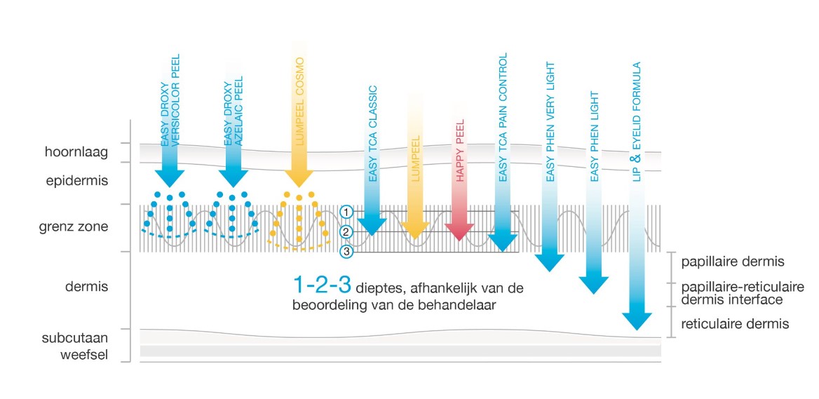 Een base solution wordt gemengd met het stofje trichloorazijnzuur. TCA is een klein molecuul wat in de diepere huidlagen terecht kan komen. De peeling zorgt ervoor dat de huidstructuur wordt verbeterd. Daarnaast kunnen de eerste tekenen van huidveroudering worden aangepakt en hyperpigmentatie kan opgelicht worden. Oppervlakkige rimpels en acne kan verminderd worden.