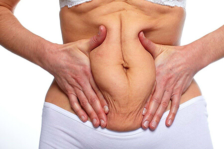 Als de huid op de onderbuik slap en uitgerekt is door bijvoorbeeld zwangerschap(pen) (striae), gewichtsverlies of veroudering. Vooral als de huid naar beneden valt, het lijkt dan op een schortje. We noemen dit ook wel een vetschortje. Het kan zijn dat het een combinatie is van vet en huid maar vaak zien we dat het alleen de huid is die zo overhangt. Dit geeft u het gevoel van een dikke buik.