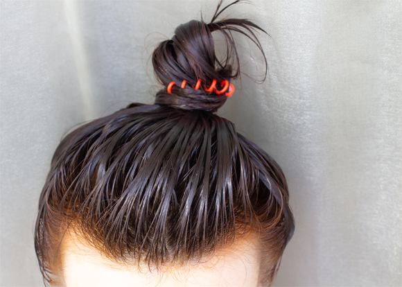 Meng de ingrediënten in een kleine kom. Voorzichtig roeren en dan het masker vanaf de wortel tot in de haarpunten opbrengen (met een grove kam). Laat het lekker warm intrekken onder de douchemuts van je oma, zo’n 15-20 minuten en spoel het masker goed uit. Laat je haar het liefst aan de lucht opdrogen. Als je meteen weg moet droog dan je haar voorzichtig met een lauwwarme föhn. Maak er geen windhooskapsel van. Zou zonde zijn.